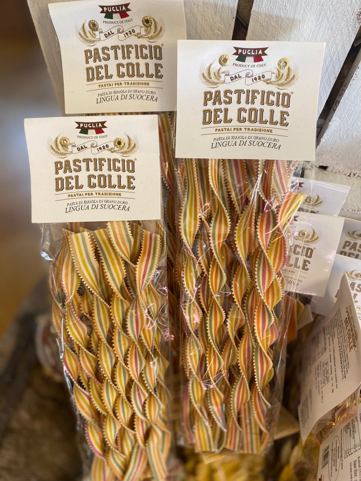 Lingua di Suocera är en dekorativ och smakrik pasta från Puglia i Italien, ofta färgad naturligt med grönsaker och kryddor. Pastan består av långa, breda band med skrovliga eller räfflade kanter som ger struktur och hjäp åt såser att fästa. De naturliga färgerna ligger kvar även efter kokning och ger en levande, festlig känsla på tallriken.